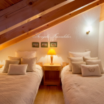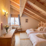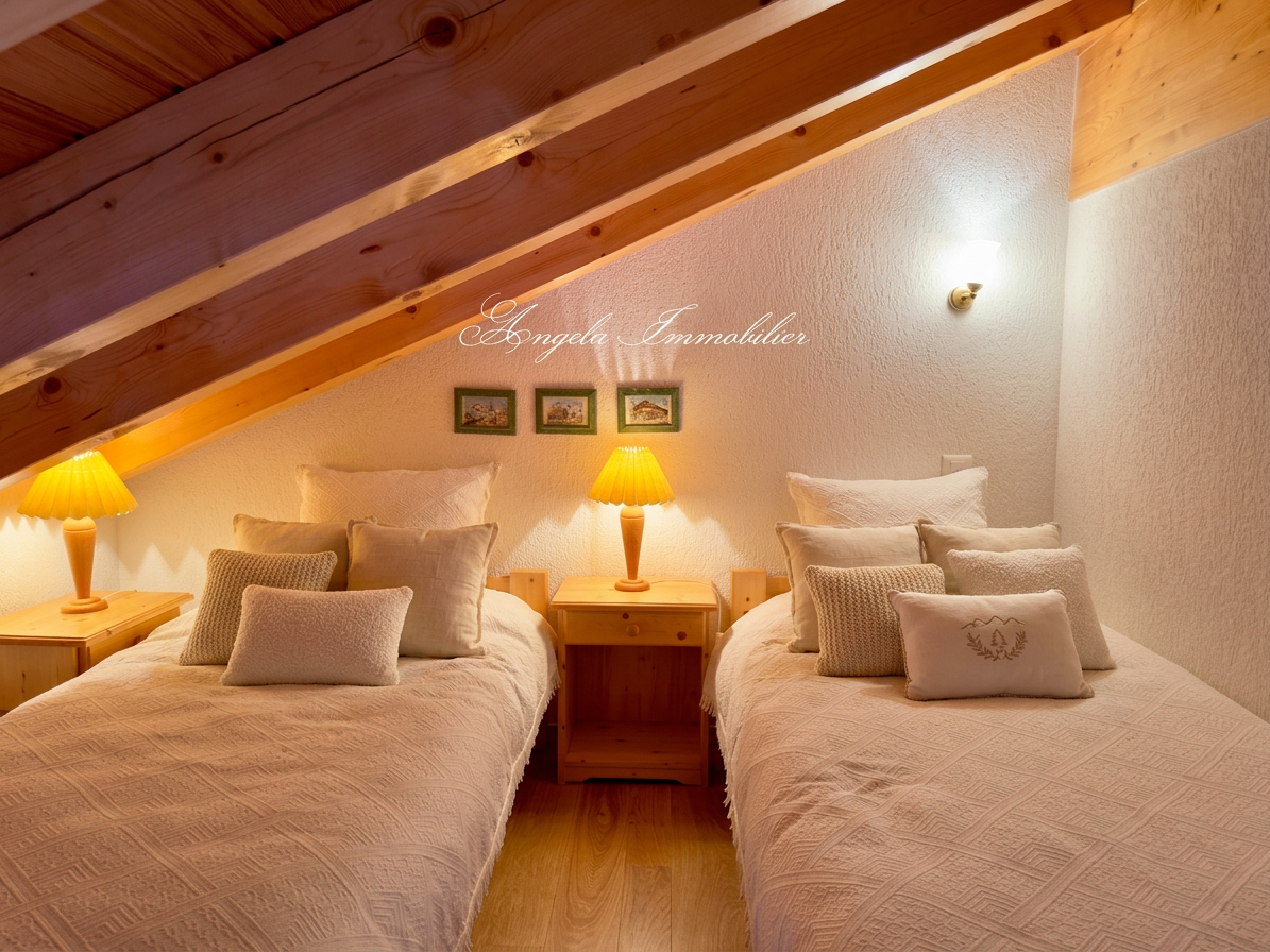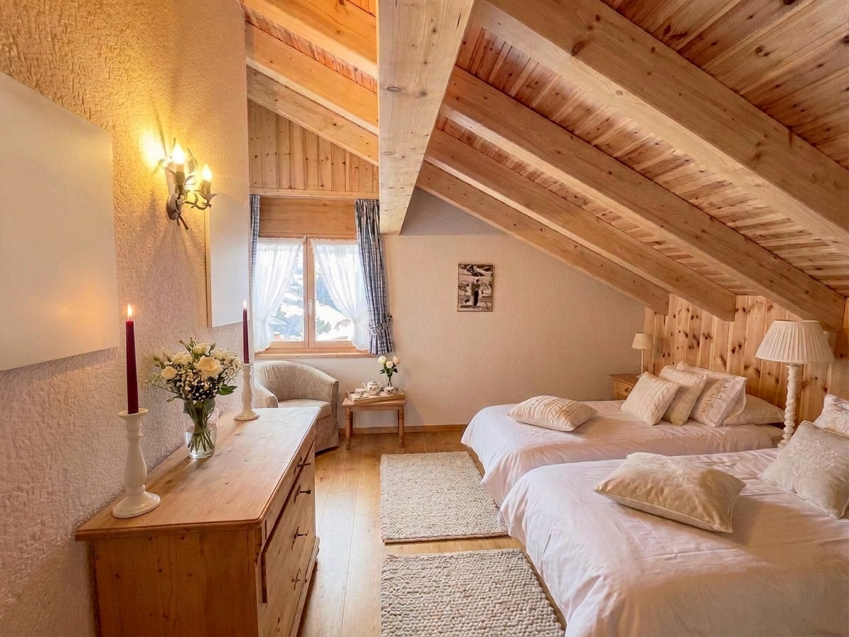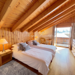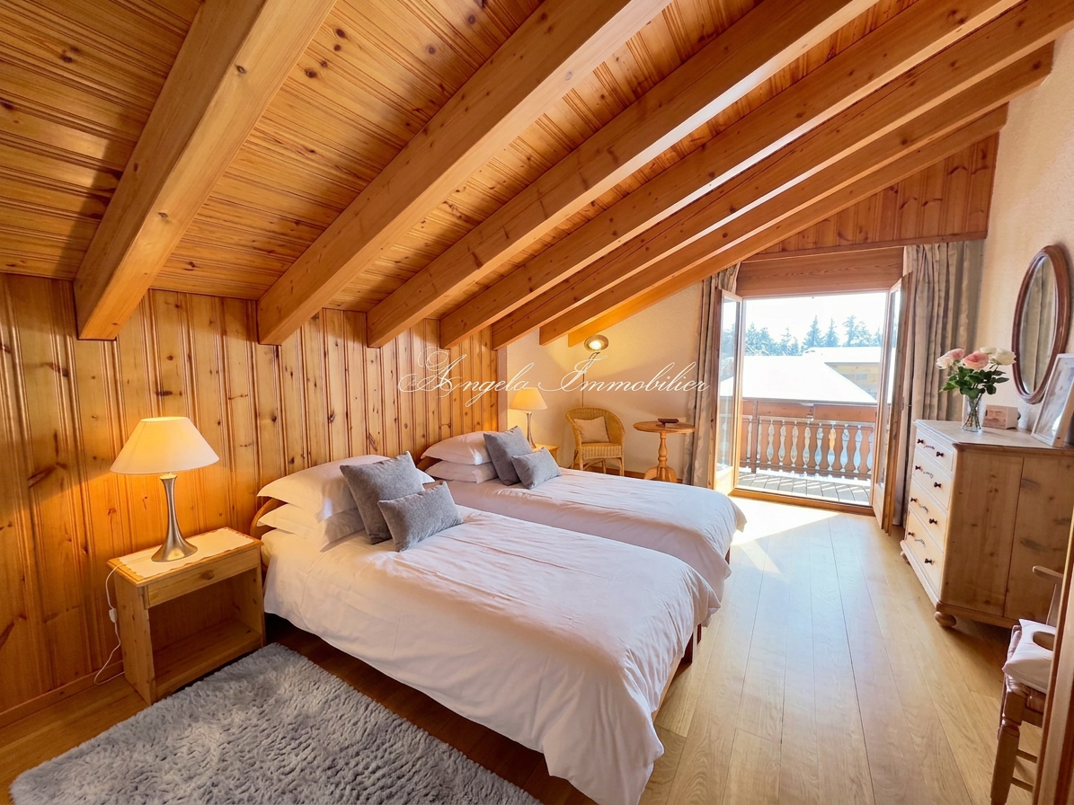 La suite parentale s’ouvre sur un balcon privé offrant une vue panoramique sur les Alpes, complétée par deux autres chambres doubles idéales pour la famille ou les invités.